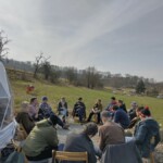 Am 9. März besuchte die Gruppe die Kommune Niederkaufungen bei Kassel. Die rund 80 Bewohner:innen haben sich dort ganz dem Klima- und Umweltschutz verschrieben. Ihr Gemüsekollektiv sorgt mit rund 2,5 Hektar Ackerland und ca. 60 Gemüsekulturen für einen hohen Grad an Selbstversorgung und vermarktet seine Produkte nach den Prinzipien der solidarischen Landwirtschaft. Der Anbau orientiert sich an den Prinzipien des regenerativen und bio-intensiven Anbaus. Fleisch und Düngemittel kommen unter anderem aus der eigenen Tierhaltung mit freilaufenden Schweinen und einer alten Rinderrasse, dem schwarzbunten Niederungsrind.